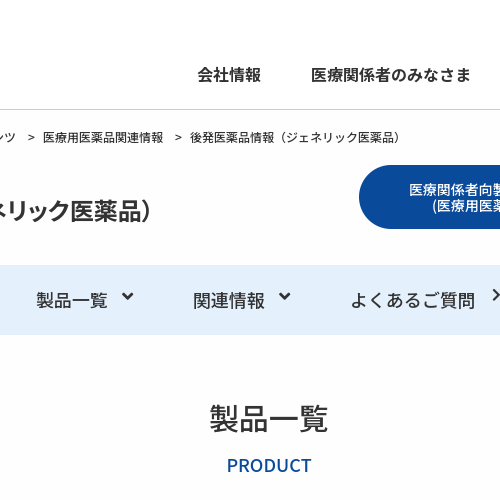 製品一覧 関連情報 よくあるご質問 製品一覧PRODUCT 後発医薬品の欄につきましては厚生労働省のホームページに掲載されている「薬価基準収載品目リスト及び後発医薬品に関する情報について」にて後発医薬品に該当するものを掲載しています。※の表記のある医薬品は、後発医薬品として承認された医薬品ですが、先発医薬品と薬価が同額又は高く、診療報酬における加算等の算定対象とならない後発医薬品です。 更新日:
