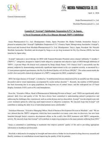 April 6, 2026 General Announcement Senju Pharmaceutical Co., Ltd. Mochida Pharmaceutical Co., Ltd. Launch of “Avarept® Ophthalmic Suspension 0.3%” in Japan, A Novel Treatment of Dry Eye Disease throug