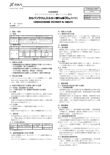 - 1 - 3. 組成・性状 3.1 組成 販 売 名 カルバゾクロムスルホン酸Na錠30mg「あすか」 有 効 成 分 1錠中 日局カルバゾクロムスルホン酸ナト リウム水和物30mg 添 加 剤 結晶セルロース、乳糖水和物、トウモロコシデンプン、 ヒドロキシプロピルセルロース、クロスカルメロースナ トリウム、ステアリン酸マグネシウム 3.2 製剤の性状 販 売 名 カルバゾクロムスルホン酸Na錠