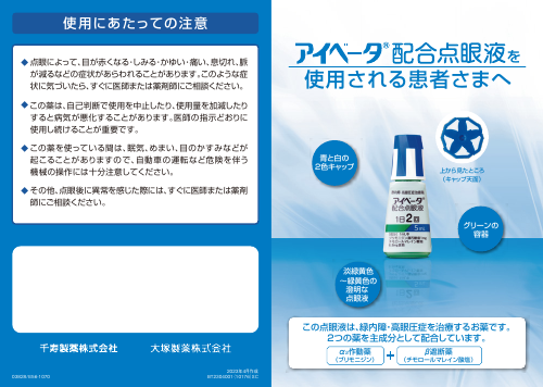 アイベータ点眼指導箋 B6 4C (4P) 256×182mm 淡緑黄色 ∼緑黄色の 澄明な 点眼液 青と白の 2色キャ ップ グリーンの 容器 使用される患者さまへ ◆ 点眼によって、 目が赤くなる ・ しみる ・ かゆい ・ 痛い、 息切れ、 脈 が減るなどの症状があらわれることがあります。 このような症 状に気づいたら、 すぐに医師または薬剤師にご相談ください。 ◆ この薬は、 自己判断で使