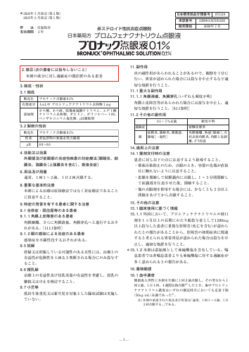 貯 法:室温保存 有効期間: 2 年 2. 禁忌 (次の患者には投与しないこと) 本剤の成分に対し過敏症の既往歴のある患者 ─ 1 ─ 3. 組成・性状 3. 1 組成 3. 2 製剤の性状 4. 効能又は効果 外眼部及び前眼部の炎症性疾患の対症療法 〔眼瞼炎、結 膜炎、強膜炎 (上強膜炎を含む) 、術後炎症〕 6. 用法及び用量 通常、 1 回 1 ∼ 2 滴、 1 日 2 回点眼する。 8.