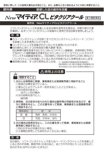 眼科薬 酷使した目の疲労を改善 販売名 NewマイティアCLビタクリアクール 1. 次の人は使用前に医師、薬剤師または登録販売者に相談すること (1) 医師の治療を受けている人。 (2) 薬などによりアレルギー症状を起こしたことがある人。 (3) 次の症状のある人。 はげしい目の痛み (4) 次の診断を受けた人。 緑内障 2. 使用後、次の症状があらわれた場合は副作用の可能性があるので、直