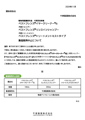 2024年11月 関係者各位 千寿製薬株式会社 動物用医薬部外品 犬用耳洗浄液 ベストフレンズ® イヤークリーナー® G 犬用シャンプー ベストフレンズ® リンスインシャンプー 犬用トリートメント ベストフレンズ® トリートメントミストタイプ 製造販売中止について 製造販売中止品目 製品名 ベストフレンズ ® イヤークリーナー ® G ベストフレンズ ® リンスインシャンプー ベストフレンズ ®