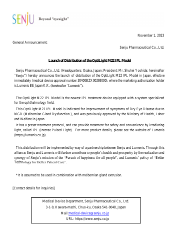d. will start the medical device business anew, aiming to further contribute to the maintenance and improvement of “pleasure to see” Quality of Vision (QOV) of patients around the world. Senju Pharmac...