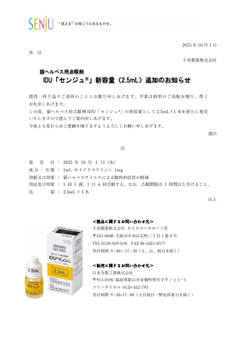 2025 年 10 月 1 日 各 位 千寿製薬株式会社 謹啓 時下益々ご清祥のこととお慶び申しあげます。平素は格別のご高配を賜り、厚く お礼申しあげます。 この度、猫ヘルペス用点眼剤 IDU「センジュ®」の新容量として 2.5mL×1 本を新たに発売 いたしますので謹んでご案内申しあげます。 今後とも変わらぬご愛顧を賜りますようよろしくお願い申しあげます。 謹白 記 発 売 日 : 2025 年