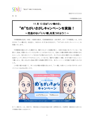 1 2025 年 11 月 13 日 各 位 千寿製薬株式会社 千寿製薬株式会社(本社:大阪府大阪市、代表取締役社⻑:吉田 周平、以下「千寿製薬」 )は、11月 13 日の「いい瞳の日」を記念し、本日から 11 月 26 日(水)まで、 「“め”ちがいさがしキャンペーン」を 実施いたします。 千寿製薬が過去に行った調査では、瞳そのものへの意識が低く、自身の充血に気づいていない「見 落とし充血」状態