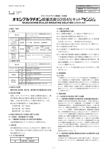 貯 法:室温保存 有効期間: 2 年 2022年 2 月改訂 (第 1 版) ─ 1 ─ 3. 組成・性状 3. 1 組成 3. 2 製剤の性状 4. 効能又は効果 眼科手術 (白内障、硝子体、緑内障) 時の眼灌流及び洗浄 6. 用法及び用量 用時、オキシグルタチオン溶液と希釈液を混合し、眼 科手術時に眼内及び眼外の灌流及び洗浄を目的とし、 通常、下記の量を目安として適量を使用する。なお、 術式