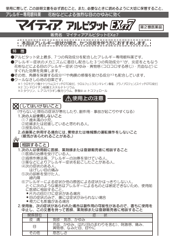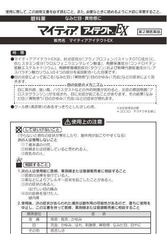 の他 息苦しさ 相談すること (守らないと現在の症状が悪化したり、副作用が起こりやすくなる) 次の人は使用しないこと (1) 7 歳未満の小児。 (2) 妊婦または妊娠していると思われる人。 (3) 授乳中の人。 してはいけないこと 特 徴 眼科薬 販売名 マイティアアイテクトEX なみだ目・異物感に 第2類医薬品 使用に際して、 この説明文書を必ず読むこと。また、 必要なときに読めるように大切に...