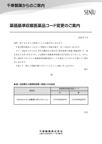 2026年 3月 謹啓 時下ますますご清祥のこととお慶び申しあげます。 平素は弊社製品につきまして格別のご高配を賜り、厚くお礼申しあげます。 さて、2026年 3 月 5 日付 厚生労働省告示第72号 「使用薬剤の薬価 (薬価基準) の一部 を改正する件」 が告示され、下記製品の薬価基準収載方式が変更になりました。それに 伴い2026年 4 月 1 日より薬価基準収載医薬品コードが変更となりますの