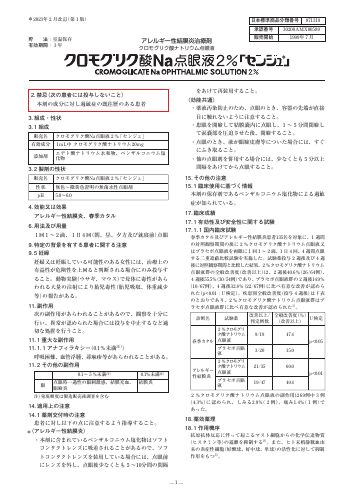 3) Kay AB, et al.:J Allergy Clin Immunol, 1987;80:1-8 4) 三国郁夫:臨床眼科, 1980;34:1551-1557 5) Hennawi MM:The Mast Cell. In:Pepys J, Edwards AM, editors. London:Pitman Medical, 1979:486-492 6) 社内資料:生物学的同等性試...