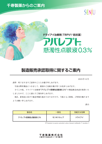 千寿製薬からのご案内 製造販売承認取得に関するご案内 2025年12月 謹啓 時下ますますご清祥のこととお慶び申しあげます。 平素は弊社製品につきまして、格別のご高配を賜り厚くお礼申しあげます。 さてこの度、ドライアイ治療剤 アバレプト懸濁性点眼液0.3% の製造販売承認を取得いた しましたので、ここに謹んでご案内申しあげます。 現在、新発売に向けて鋭意準備を進めておりますので、今後ともご指導、ご