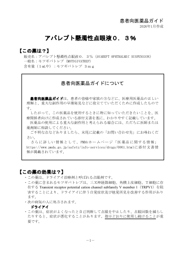 -1- 患者向医薬品ガイド 2026年1月作成 アバレプト懸濁性点眼液0.3% 【この薬は?】 販売名:アバレプト懸濁性点眼液0.3%(AVAREPT OPHTHALMIC SUSPENSION) 一般名:モツギバトレプ(MOTUGIVATREP) 含有量(1mL中):モツギバトレプ 3mg 患者向医薬品ガイドについて 患者向医薬品ガイドは、患者の皆様や家族の方などに、医療用医薬品の正しい 理解と...
