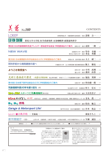 No.160 CONTENTS 編集後記……2 ■エピナスチン塩酸塩点眼液0.05% 「センジュ」 のご案内……39 ■ベス トロン耳鼻科用1%のご案内……44 和歌山県立医科大学 講師 大谷真喜子……28 第42回 …… 4 群馬大学大学院 医学系研究科 耳鼻咽喉科 ・ 頭頸部外科学 大阪市北区・北野病院 耳鼻咽喉科・頭頸部外科特任部長/難聴 ・ 鼓膜再生センター長 金丸 眞一……3...