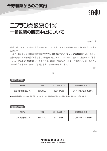 千寿製薬からのご案内 2025年 1月 謹啓 時下益々ご清祥のこととお慶び申しあげます。平素は格別のご高配を賜り厚くお礼申し あげます。 さて、非ステロイド性抗炎症点眼剤 ニフラン点眼液0.1% の 『5mL×50本包装』 につきましては、 諸般の事情により在庫消尽をもちまして販売を中止させていただきたく、謹んでご案内申しあげます。 なお、 『5mL×10本包装』 につきましては、継続して販売
