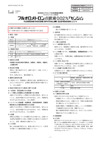貯 法:室温保存 有効期間: 3 年 2023年12月改訂 (第 1 版) ─ 1 ─ 3. 組成・性状 3. 1 組成 3. 2 製剤の性状 4. 効能又は効果 外眼部及び前眼部の炎症性疾患の対症療法 (眼瞼炎、結 膜炎、角膜炎、強膜炎、上強膜炎、前眼部ブドウ膜炎、 術後炎症) 6. 用法及び用量 用時よく振り混ぜたのち、通常、1 日 3 ∼ 5 回、1 回 1 ∼ 2 滴宛点眼する。なお症状