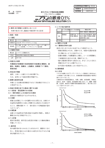 貯 法:室温保存 有効期間: 3 年 2023年 2 月改訂 (第 1 版) 2. 禁忌 (次の患者には投与しないこと) 本剤の成分に対し過敏症の既往歴のある患者 ─ 1 ─ 3. 組成・性状 3. 1 組成 3. 2 製剤の性状 4. 効能又は効果 外眼部及び前眼部の炎症性疾患の対症療法 (眼瞼炎、結 膜炎、角膜炎、強膜炎、上強膜炎、前眼部ブドウ膜炎、 術後炎症) 6. 用法及び用量 通常、