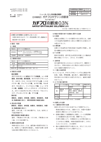 貯 法:室温保存 有効期間: 3 年 注) 注意─医師等の処方箋により使用すること 2. 禁忌 (次の患者には投与しないこと) 本剤の成分又はキノロン系抗菌剤に対し過敏症の 既往歴のある患者 ─ 1 ─ 3. 組成・性状 3. 1 組成 3. 2 製剤の性状 4. 効能又は効果 〈適応菌種〉 ガチフロキサシンに感性のブドウ球菌属、レンサ球 菌属、肺炎球菌、腸球菌属、モラクセラ (ブランハメ ラ)