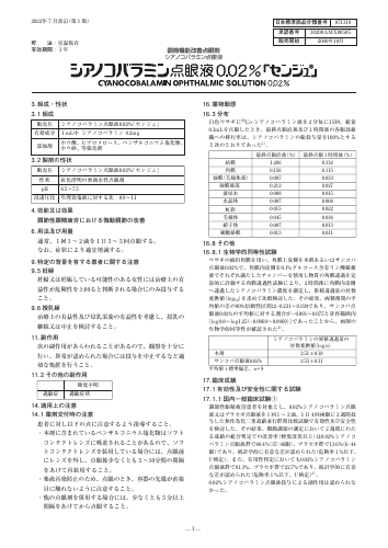 貯 法:室温保存 有効期間: 3 年 2022年 7 月改訂 (第 1 版) ─ 1 ─ 3. 組成・性状 3. 1 組成 3. 2 製剤の性状 4. 効能又は効果 調節性眼精疲労における微動調節の改善 6. 用法及び用量 通常、 1 回 1 ∼ 2 滴を 1 日 3 ∼ 5 回点眼する。 なお、症状により適宜増減する。 9. 特定の背景を有する患者に関する注意 9. 5 妊婦 妊婦又は妊娠して