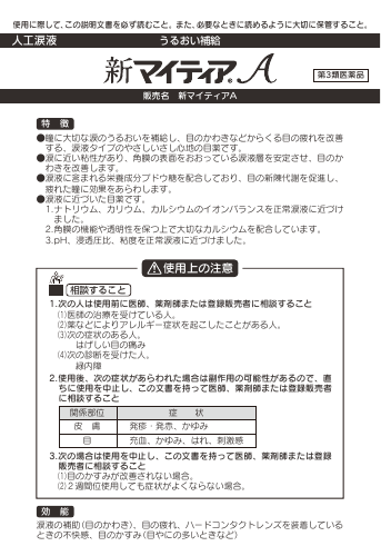 1. 次の人は使用前に医師、薬剤師または登録販売者に相談すること (1) 医師の治療を受けている人。 (2) 薬などによりアレルギー症状を起こしたことがある人。 (3) 次の症状のある人。 はげしい目の痛み (4) 次の診断を受けた人。 緑内障 2. 使用後、次の症状があらわれた場合は副作用の可能性があるので、直 ちに使用を中止し、この文書を持って医師、薬剤師または登録販売者 に相談するこ