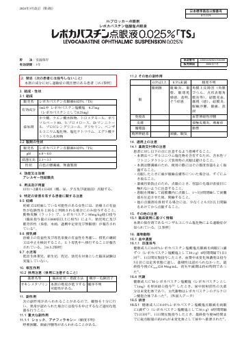 2024年3月改訂(第1版) 日本標準商品分類番号 871319 承認番号 22000AMX01306000 販売開始 2008年7月 貯 法:室温保存 有効期間:3年 H1ブロッカー点眼剤 レボカバスチン塩酸塩点眼液 2. 禁忌(次の患者には投与しないこと) 本剤の成分に対し過敏症の既往歴のある患者[15.1参照] 3. 組成・性状 3.1 組成 販売名 レボカバスチン点眼液0.025%「TS」