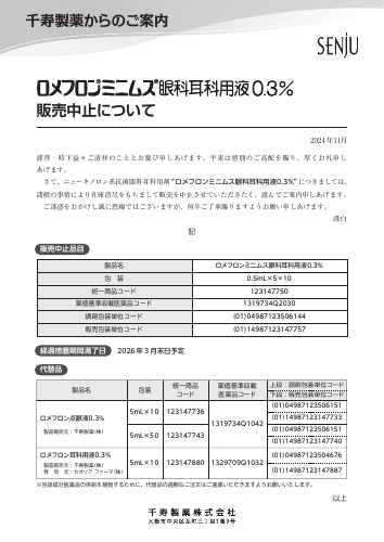 千寿製薬からのご案内 以上 2024年11月 謹啓 時下益々ご清祥のこととお慶び申しあげます。平素は格別のご高配を賜り、厚くお礼申し あげます。 さて、ニューキノロン系抗菌眼科耳科用剤 ロメフロンミニムス眼科耳科用液0.3% につきましては、 諸般の事情により在庫消尽をもちまして販売を中止させていただきたく、謹んでご案内申しあげます。 ご迷惑をおかけし誠に恐縮ではございますが、何卒ご了承賜りま
