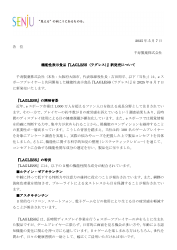 2025 年 5 月 7 日 各 位 千寿製薬株式会社 機能性表示食品『LAGLESS(ラグレス) 』新発売について 千寿製薬株式会社(本社:大阪府大阪市、代表取締役社長:吉田周平、以下「当社」 )は、e ス ポーツプレイヤーと共同開発した機能性表示食品 『LAGLESS (ラグレス) 』 を 2025 年 5 月 7 日 に新発売いたします。 『LAGLESS』の開発背景 近年、 e スポーツ市