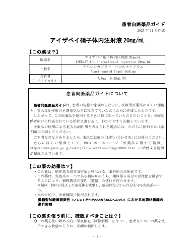 - 1 - 患者向医薬品ガイド 2025 年 11 月作成 アイザベイ硝子体内注射液 20mg/mL 【この薬は?】 販売名 アイザベイ硝子体内注射液 20mg/mL IZERVAY for intravitreal injection 20mg/mL 一般名 アバシンカプタド ペゴルナトリウム Avacincaptad Pegol Sodium 含有量 (1 バイアル中) 7.0mg(0.35m