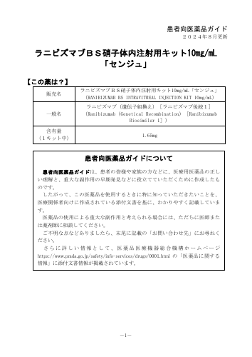 -1- 患者向医薬品ガイド 2024年8月更新 ラニビズマブBS硝子体内注射用キット10mg/mL 「センジュ」 【この薬は?】 販売名 ラニビズマブBS硝子体内注射用キット10mg/mL「センジュ」 (RANIBIZUMAB BS INTRAVITREAL INJECTION KIT 10mg/mL) 一般名 ラニビズマブ(遺伝子組換え)[ラニビズマブ後続1] (Ranibizumab(Gene