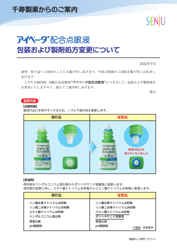 包装および製剤処方変更について 2025年 9月 謹啓 時下益々ご清祥のこととお慶び申しあげます。平素は格別のご高配を賜り厚くお礼申し あげます。 このたび緑内障・高眼圧症治療剤 アイベータ配合点眼液 につきまして、包装および製剤処方 を変更いたしますので、謹んでご案内申しあげます。 謹白 千寿製薬からのご案内 変更内容 【点眼容器】 薬液の出口を見やすくするため、ノズル下部の色を変更します。