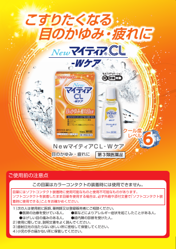 NewマイティアCL ‐W ケア 目のかゆみ・疲れに こすりたくなる 目のかゆみ・疲れに 6 6 クール度 レベル クール度 レベル 目薬にはソフトコンタクト装着時に使用可能なものと使用不可能なものがあります。 ソフトコンタクトを装着したまま目薬を使用する場合は、 必ず外箱や添付文書で 「ソフトコンタクト装 着時に使用できる」 ことをお確かめください。 1) 次の人は使用前に医師、 薬剤師又は登