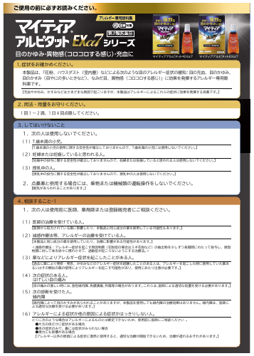 1.症状をお確かめください。 2.用法・用量をお守りください。 1 回 1 ~ 2 滴、1 日 4 回点眼してください。 本製品は、 「花粉、ハウスダスト(室内塵)などによる次のような目のアレルギー症状の緩和:目の充血、目のかゆみ、 目のかすみ(目やにの多いときなど) 、なみだ目、異物感(コロコロする感じ) 」に効果を発揮するアレルギー専用眼 科薬です。 【充血やかゆみ、かすみなどはさまざまな原因
