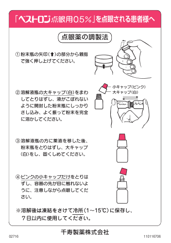 「 」 を点眼される患者様へ 110116706 02716 千寿製薬株式会社 点眼薬の調製法 ※溶解後は凍結をさけて冷所 (1∼15℃) に保存し、 7日以内に使用してください。
