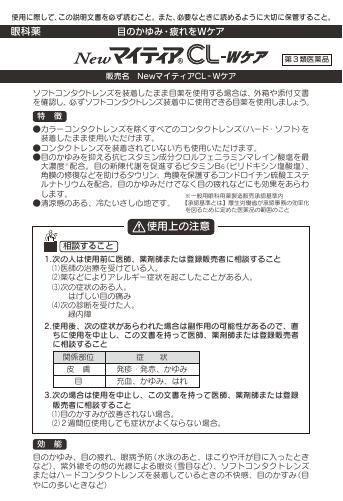 眼科薬 目のかゆみ・疲れをWケア 販売名 NewマイティアCL‐Wケア 1. 次の人は使用前に医師、薬剤師または登録販売者に相談すること (1) 医師の治療を受けている人。 (2) 薬などによりアレルギー症状を起こしたことがある人。 (3) 次の症状のある人。 はげしい目の痛み (4) 次の診断を受けた人。 緑内障 2. 使用後、次の症状があらわれた場合は副作用の可能性があるので、直 ちに