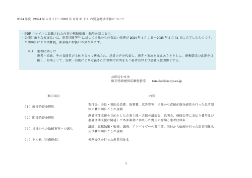 1 2024 年度(2024 年 4 月 1 日~2025 年 3 月 31 日)の資金提供情報について お問合わせ先 販売情報提供活動監督室 tomeisei@senju.co.jp 開示項目 内容 (1)直接的資金提供 寄付金、会員・賛助会員費、協賛費、広告費等、当社から直接的資金提供を行った患者団 体の費用項目ごとの金額 (2)間接的資金提供 患者団体支援を目的とした企業主催・共催の講演会、