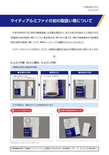 千寿製薬株式会社 2025年1月 マイティアルミファイの封の取扱い等について 平成30年8月1日に厚生労働省医薬・生活衛生局長より、 改ざん防止を目的として発出された 品 薬 医 る す 売 販 造 製 が 社 弊 、 き づ 基 に ) 号 1 第 1 0 8 0 発 生 薬 ( 」 て い つ に 等 い 扱 取 の 封 の 品 薬 医 「 の封に関する取扱い等について、 弊社ホームページに