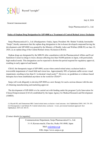 adquarters: Osaka, Japan; President: Mr. Shuhei Yoshida; hereinafter “Senju”) hereby announces that the orphan drug designation to the in-house developed compound having the development code SJP-0008 ...